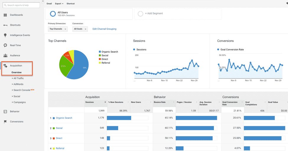 Before we get into what Google Analytics can’t tell you, let’s take a quick look at some of the things Analytics can tell you. It’s a highly traffic-centric program that mostly focuses on how much traffic you’re getting, where that traffic comes from, and when they leave. Analytics can tell you all of these things and more: