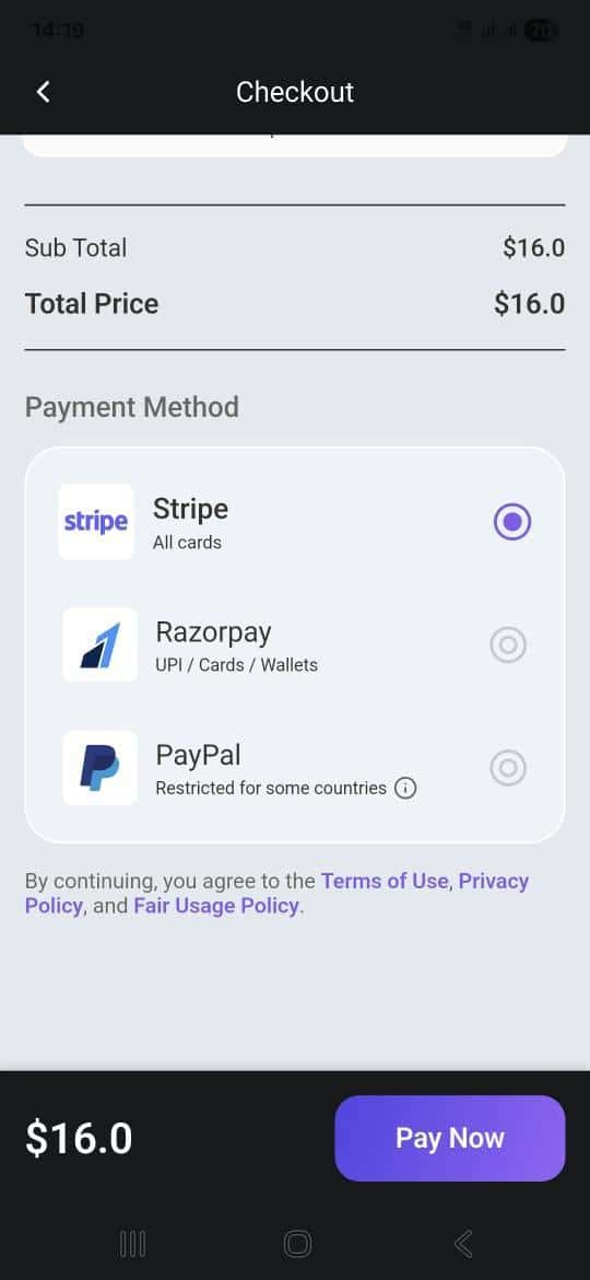 | Payment Methods | Credit/debit cards, PayPal, Apple Pay, Google Pay, UPI |